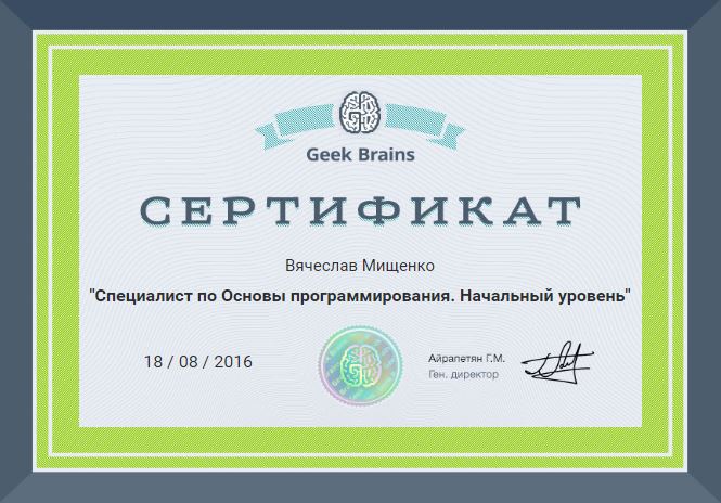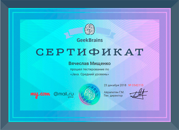 2018 год-получен сертификат по программированию на java среднего уровня.