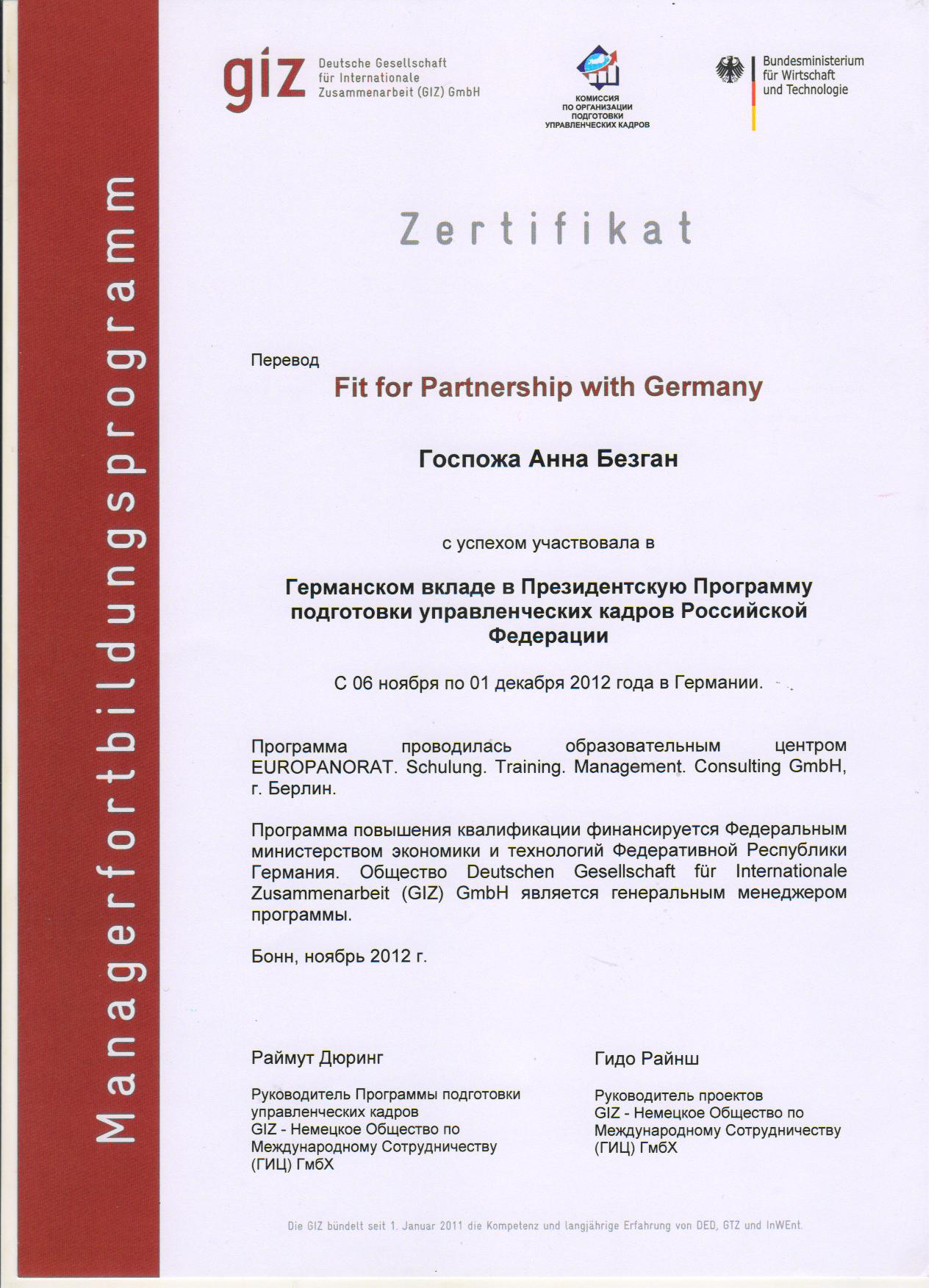 Международная стажировка в рамках Президентской программы подготовки управленческих кадров РФ (Министерство экономики Германии, имеется Сертификат)