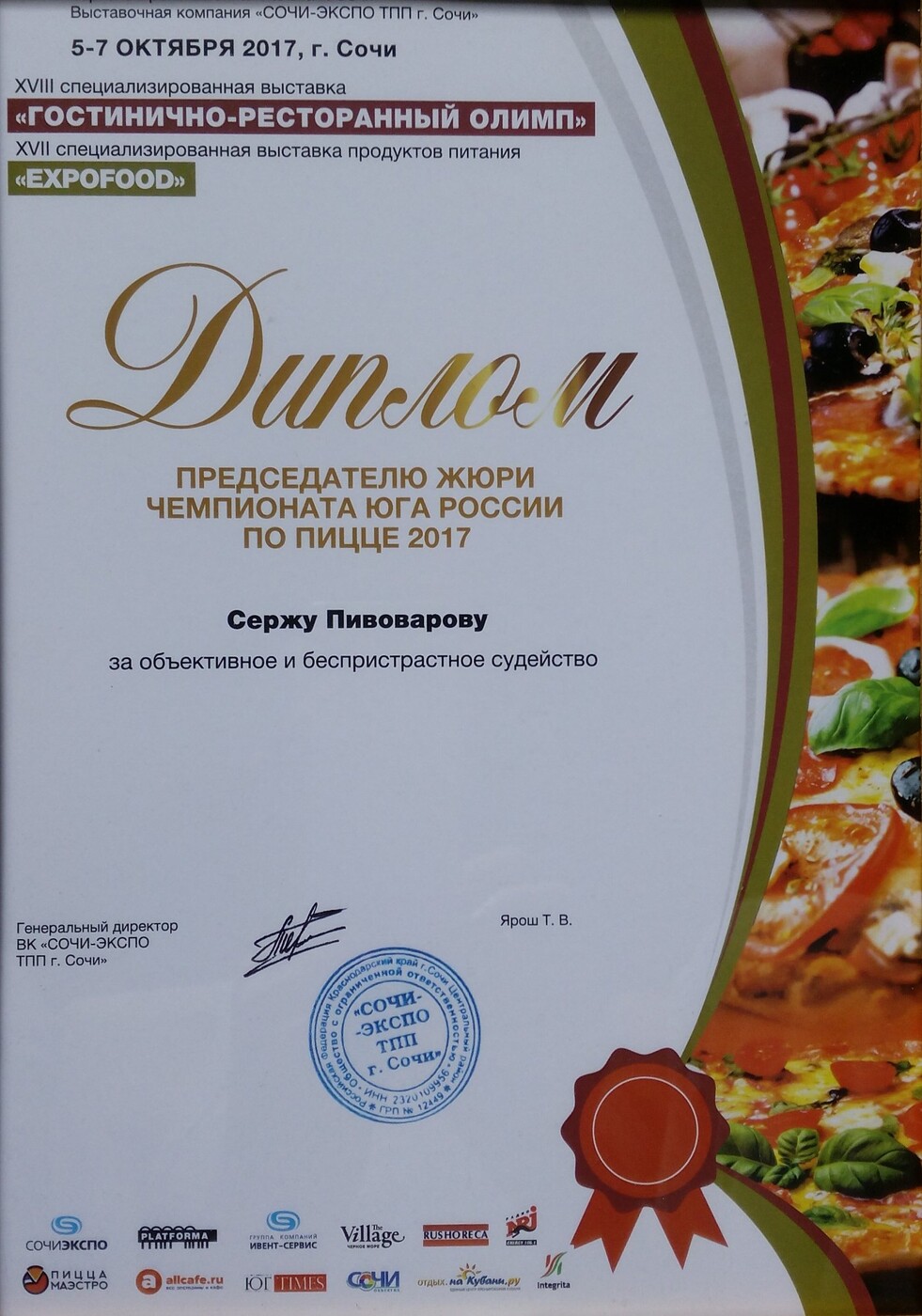2017 Председатель жюри Чемпионата Юга России по пицце (Сочи).