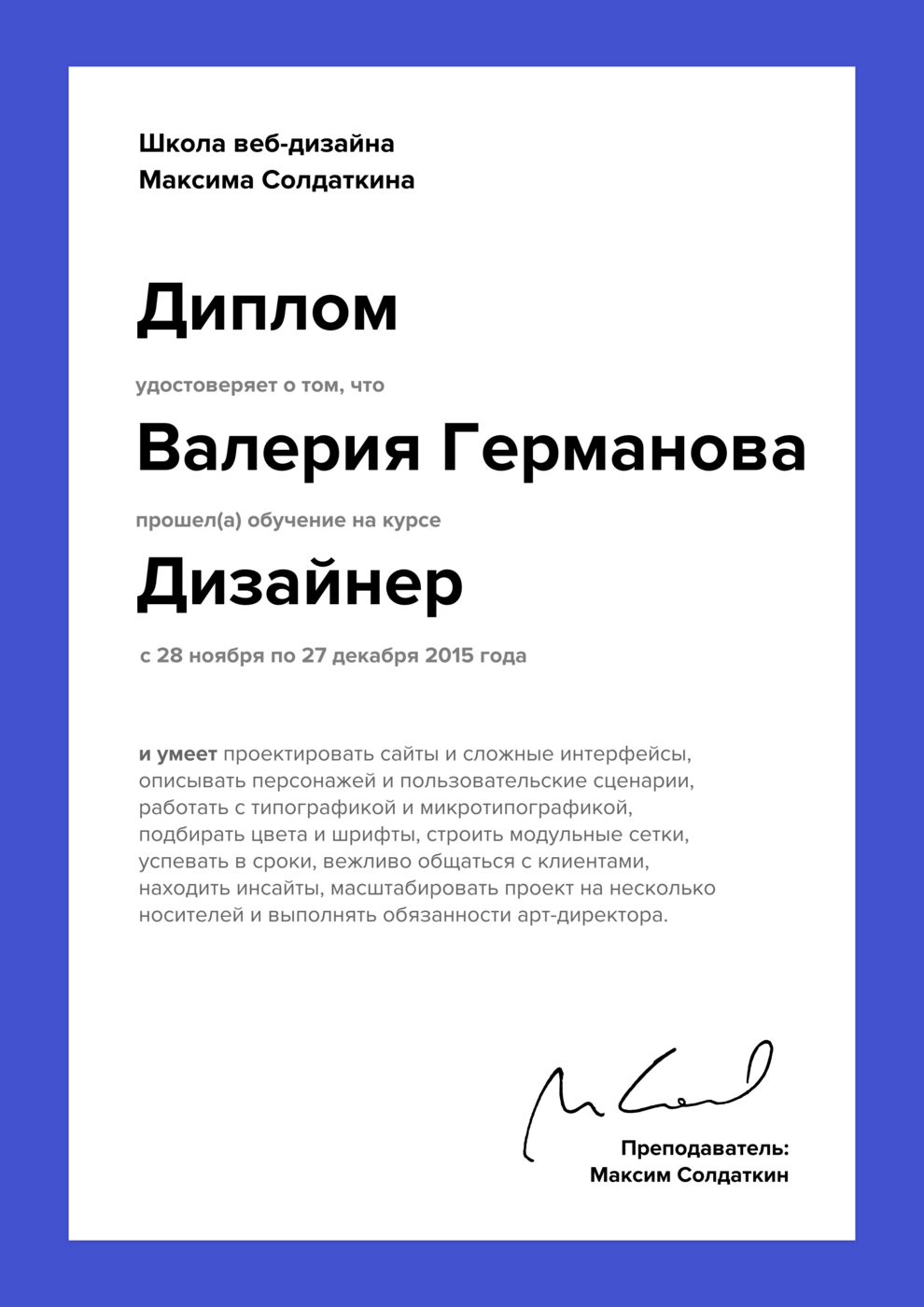 Также закончила школу веб-дизайна Максима Солдаткина.